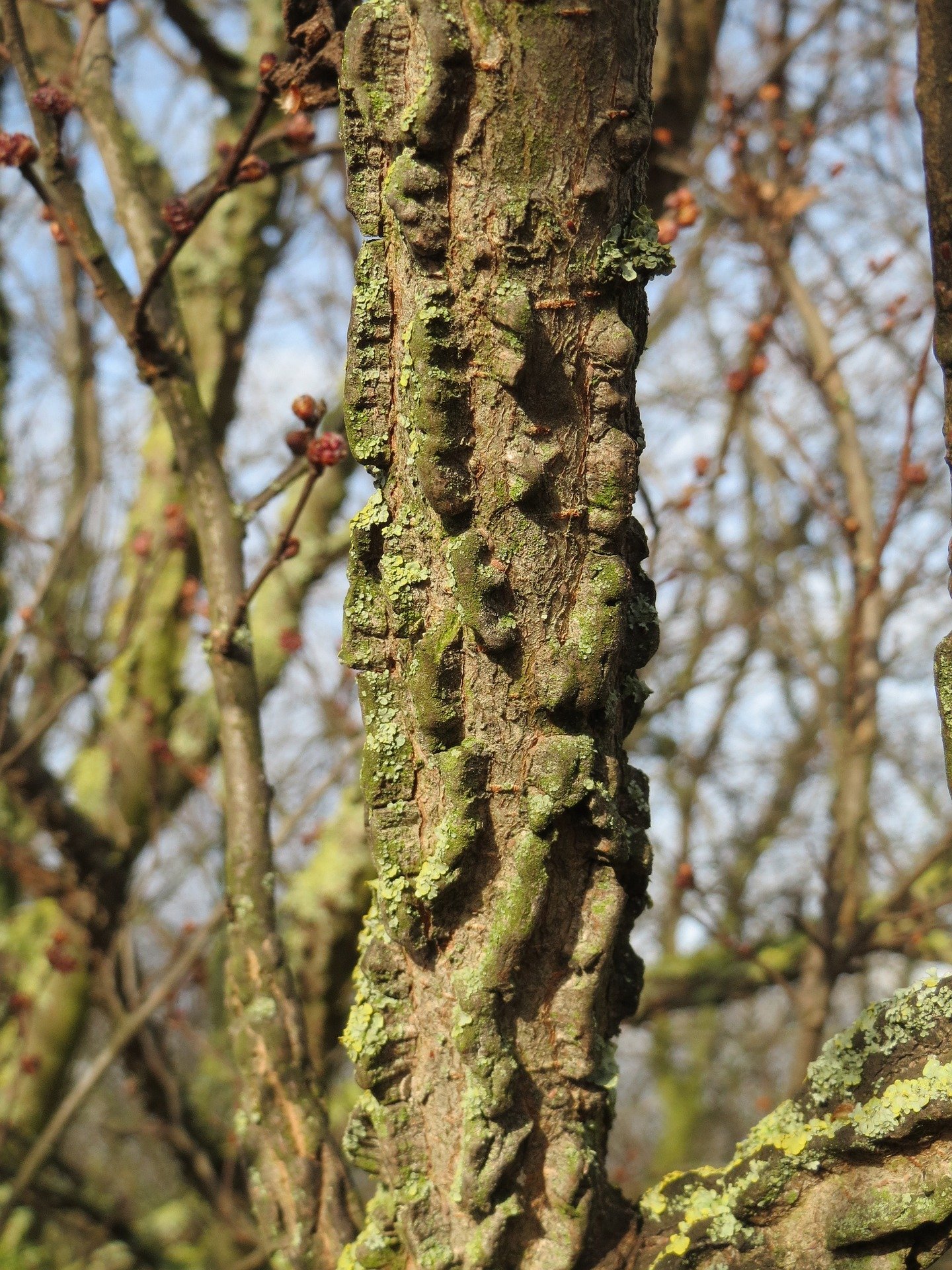 느릅나무 껍질: 미국 느릅나무껍질은 회갈색이며 깊은 다이아몬드 모양의 균열과 넓은 능선이 있습니다.
